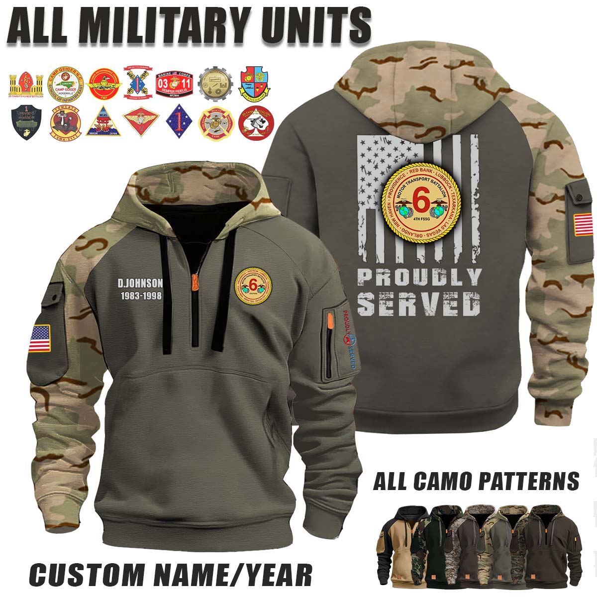 This 6th MTBN 6th Motor Transport Battalion_Camo Halfzip Hoodie lets you customize your Branch, Unit, Role, Rank, and Years Served — so your service, sacrifice, and pride live on.