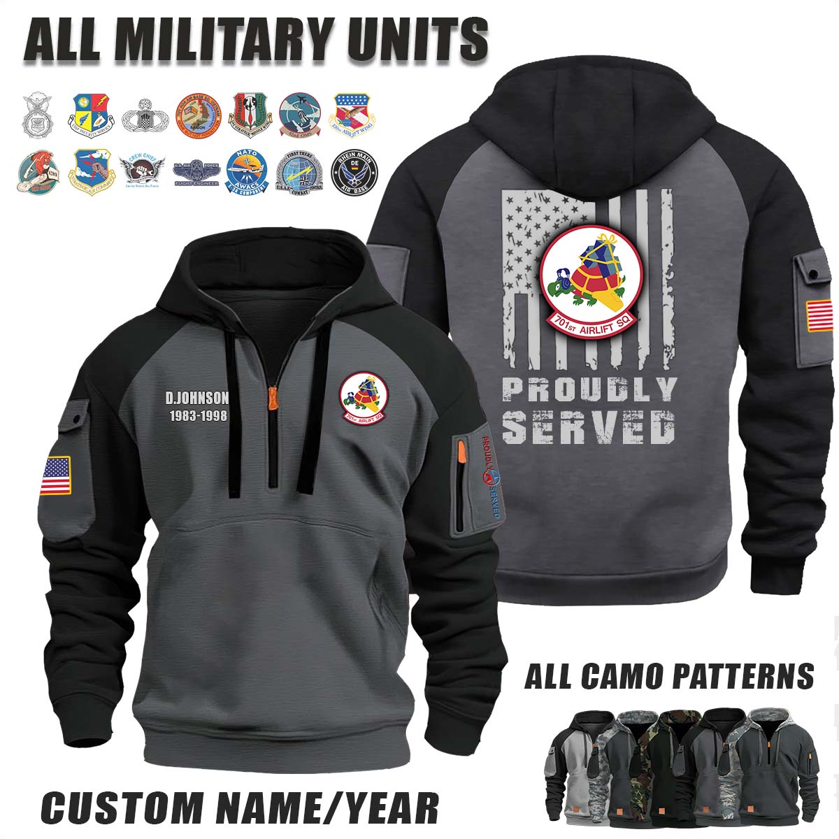 This 701st AS Airlift Squadron_Camo Halfzip Hoodie lets you customize your Branch, Unit, Role, Rank, and Years Served — so your service, sacrifice, and pride live on.