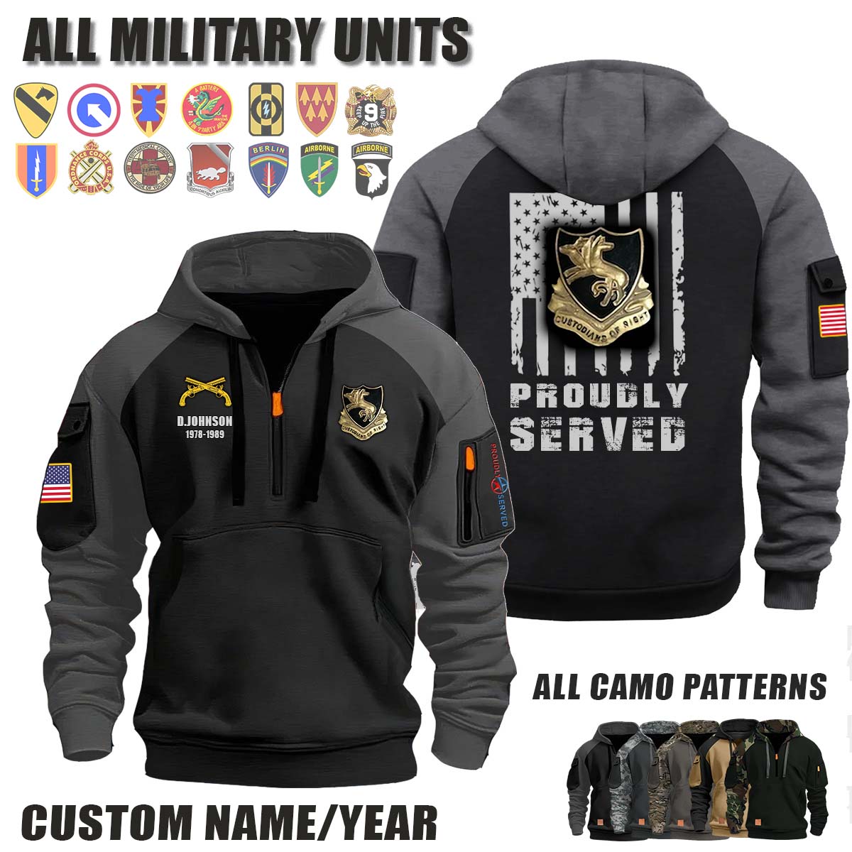 This 725th MP BN 725th Military Police Battalion_Camo Halfzip Hoodie lets you customize your Branch, Unit, Role, Rank, and Years Served — so your service, sacrifice, and pride live on.