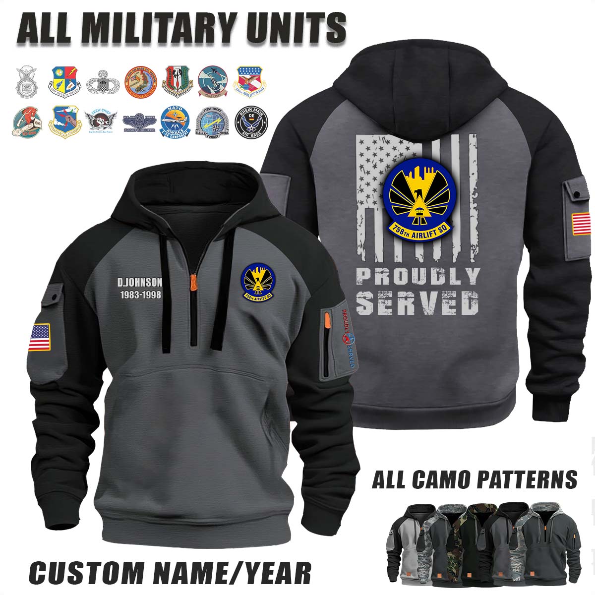 This 758th AS Airlift Squadron_Camo Halfzip Hoodie lets you customize your Branch, Unit, Role, Rank, and Years Served — so your service, sacrifice, and pride live on.