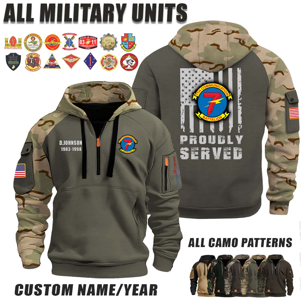 This 7th Comm 7th Communication Battalion_Camo Halfzip Hoodie lets you customize your Branch, Unit, Role, Rank, and Years Served — so your service, sacrifice, and pride live on.