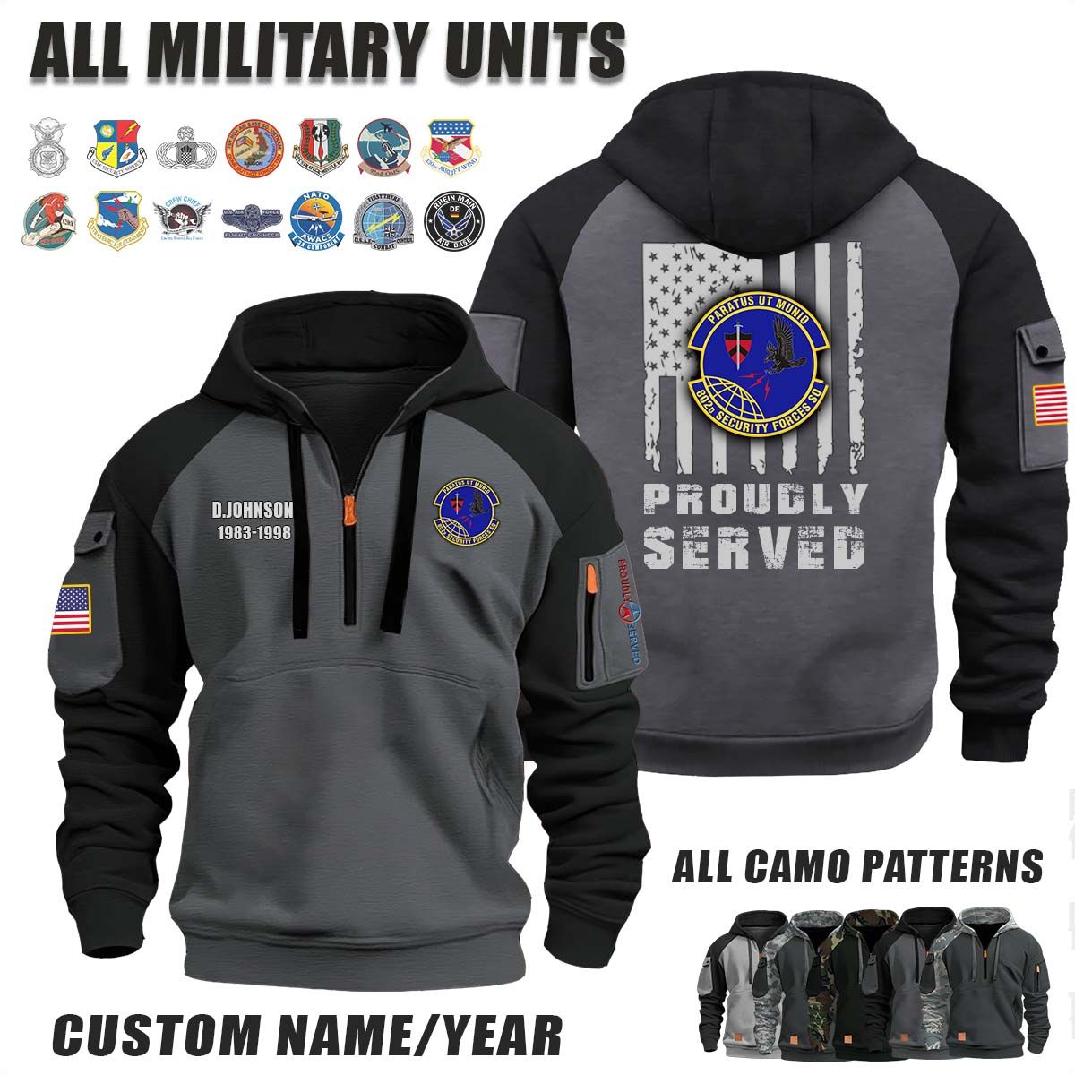 This 802d SFS Security Forces Squadron_Camo Halfzip Hoodie lets you customize your Branch, Unit, Role, Rank, and Years Served — so your service, sacrifice, and pride live on.