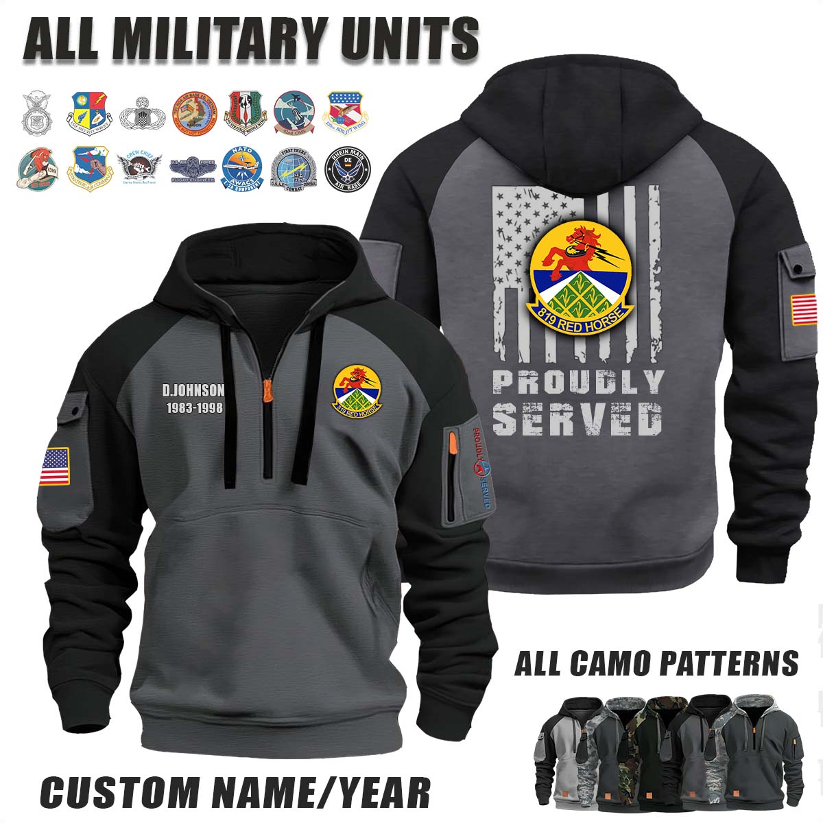 This 819th RED HORSE Squadron_Camo Halfzip Hoodie lets you customize your Branch, Unit, Role, Rank, and Years Served — so your service, sacrifice, and pride live on.