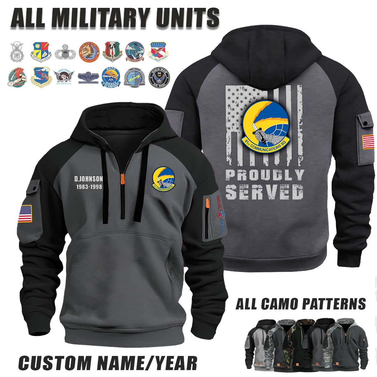 This 81st CS Communications Squadron_Camo Halfzip Hoodie lets you customize your Branch, Unit, Role, Rank, and Years Served — so your service, sacrifice, and pride live on.