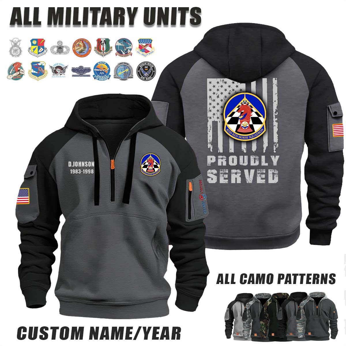 This 823d RHS RED HORSE Squadron_Camo Halfzip Hoodie lets you customize your Branch, Unit, Role, Rank, and Years Served — so your service, sacrifice, and pride live on.