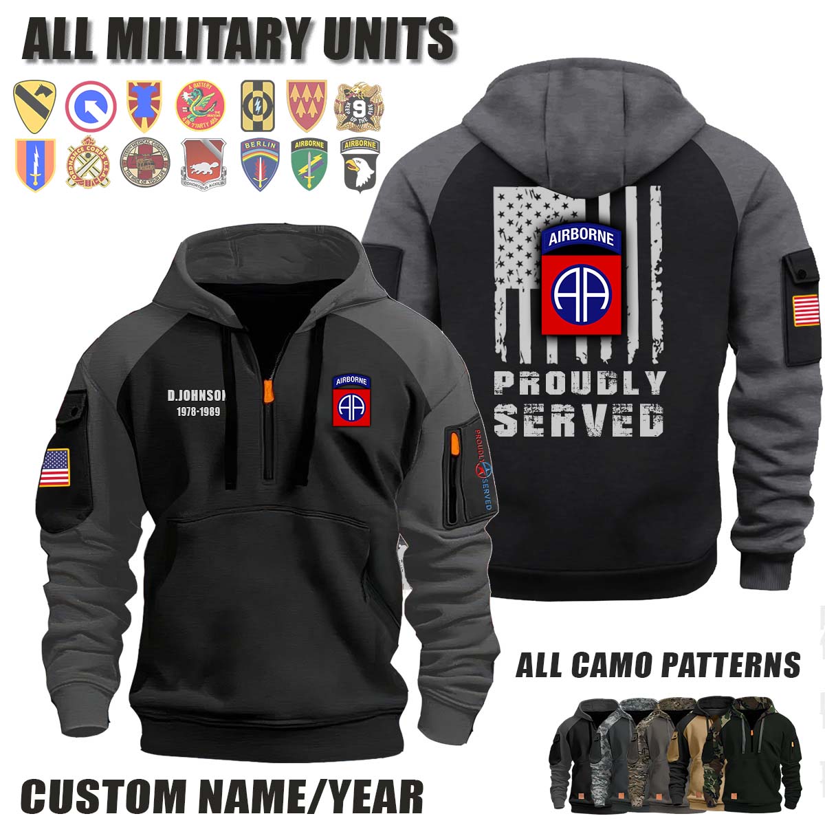 This 82nd ABN DIV 82nd Airborne Division_Camo Halfzip Hoodie lets you customize your Branch, Unit, Role, Rank, and Years Served — so your service, sacrifice, and pride live on.