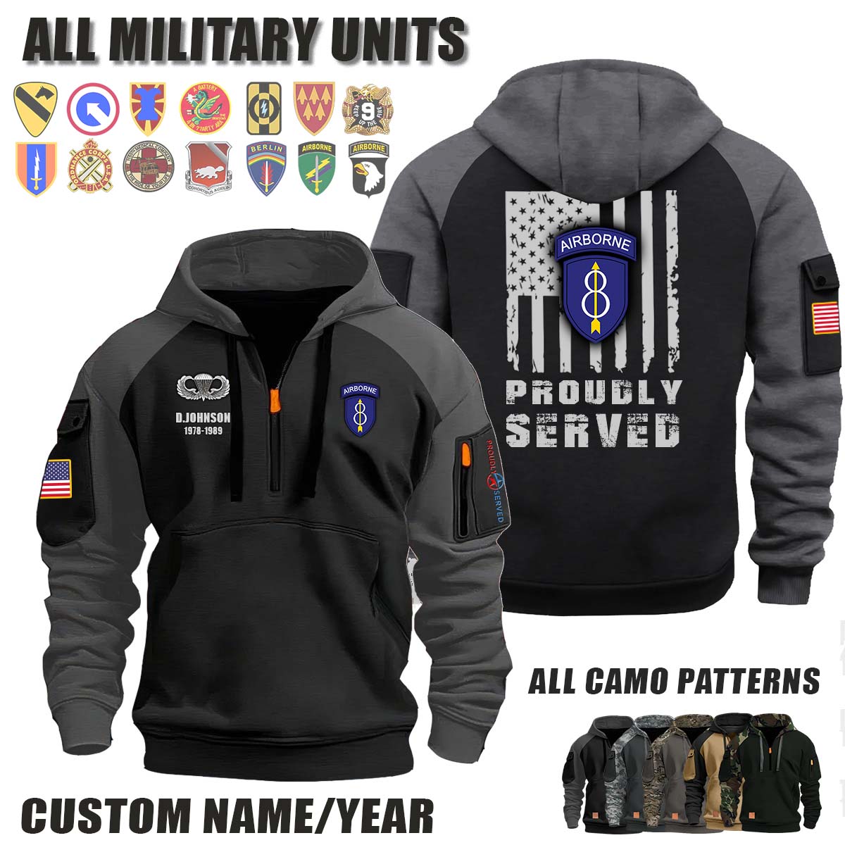 This 8th ID 8th Infantry Division Airborne_Camo Halfzip Hoodie lets you customize your Branch, Unit, Role, Rank, and Years Served — so your service, sacrifice, and pride live on.