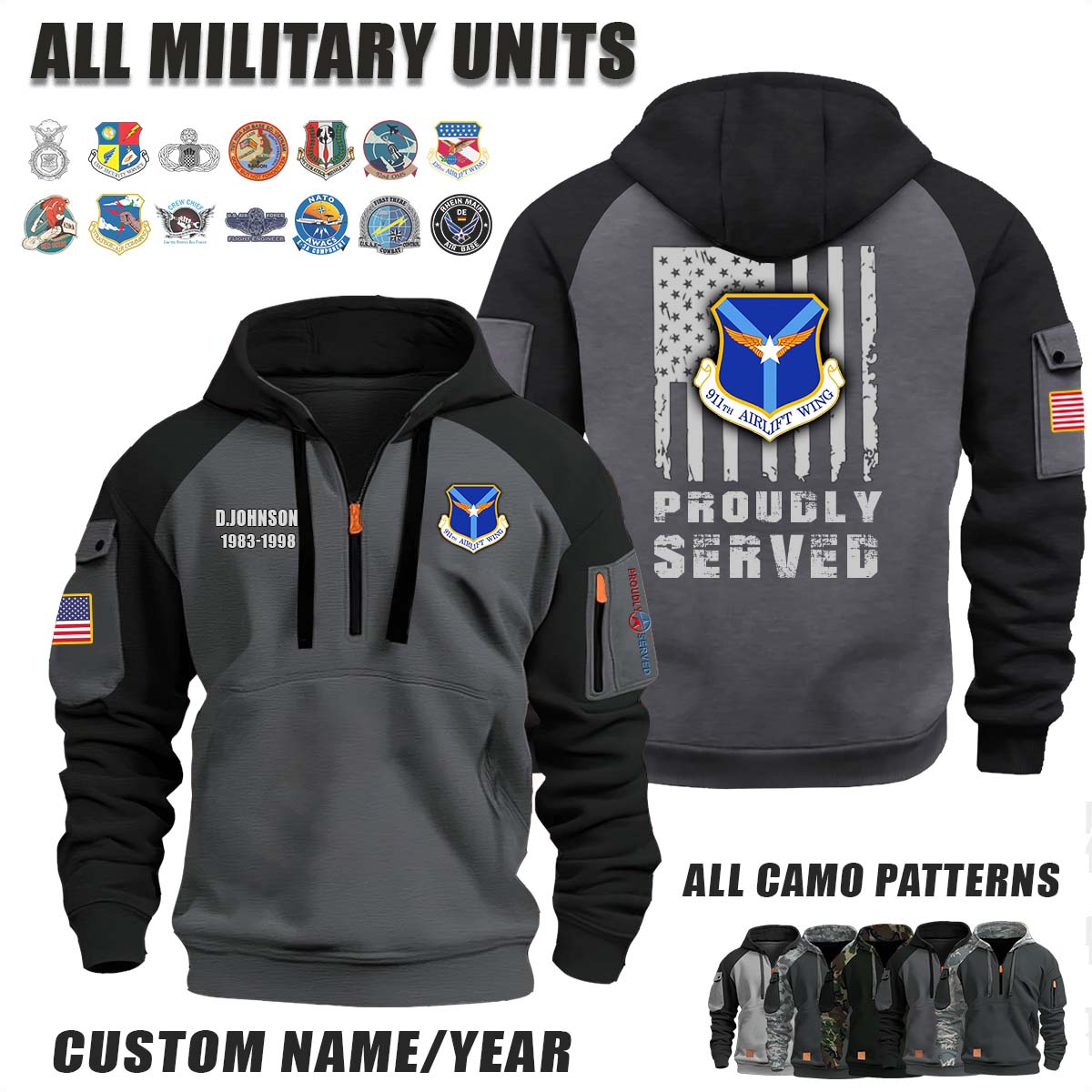 This 911th AW Airlift Wing_Camo Halfzip Hoodie lets you customize your Branch, Unit, Role, Rank, and Years Served — so your service, sacrifice, and pride live on.