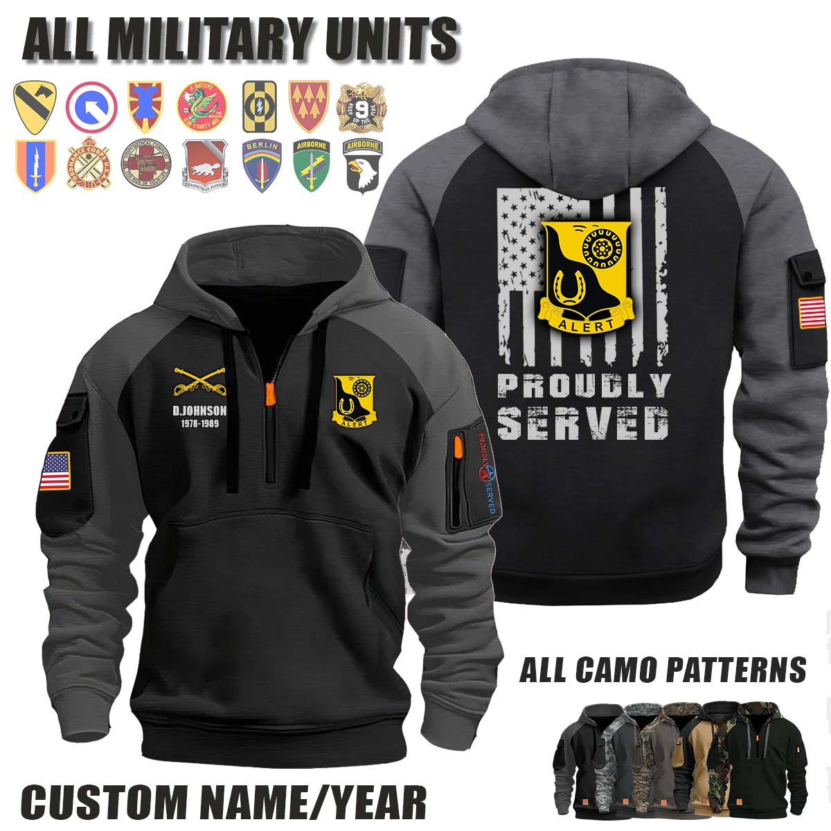 This 91st Cavalry Regiment_Camo Halfzip Hoodie lets you customize your Branch, Unit, Role, Rank, and Years Served — so your service, sacrifice, and pride live on.