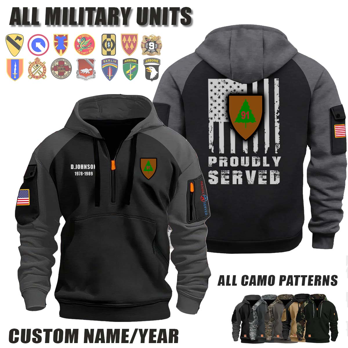This 91st ID 91st Infantry Division_Camo Halfzip Hoodie lets you customize your Branch, Unit, Role, Rank, and Years Served — so your service, sacrifice, and pride live on.