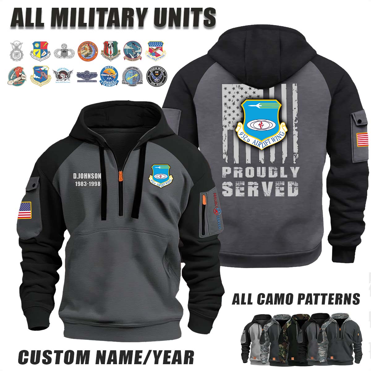 This 932nd AW Airlift Wing_Camo Halfzip Hoodie lets you customize your Branch, Unit, Role, Rank, and Years Served — so your service, sacrifice, and pride live on.