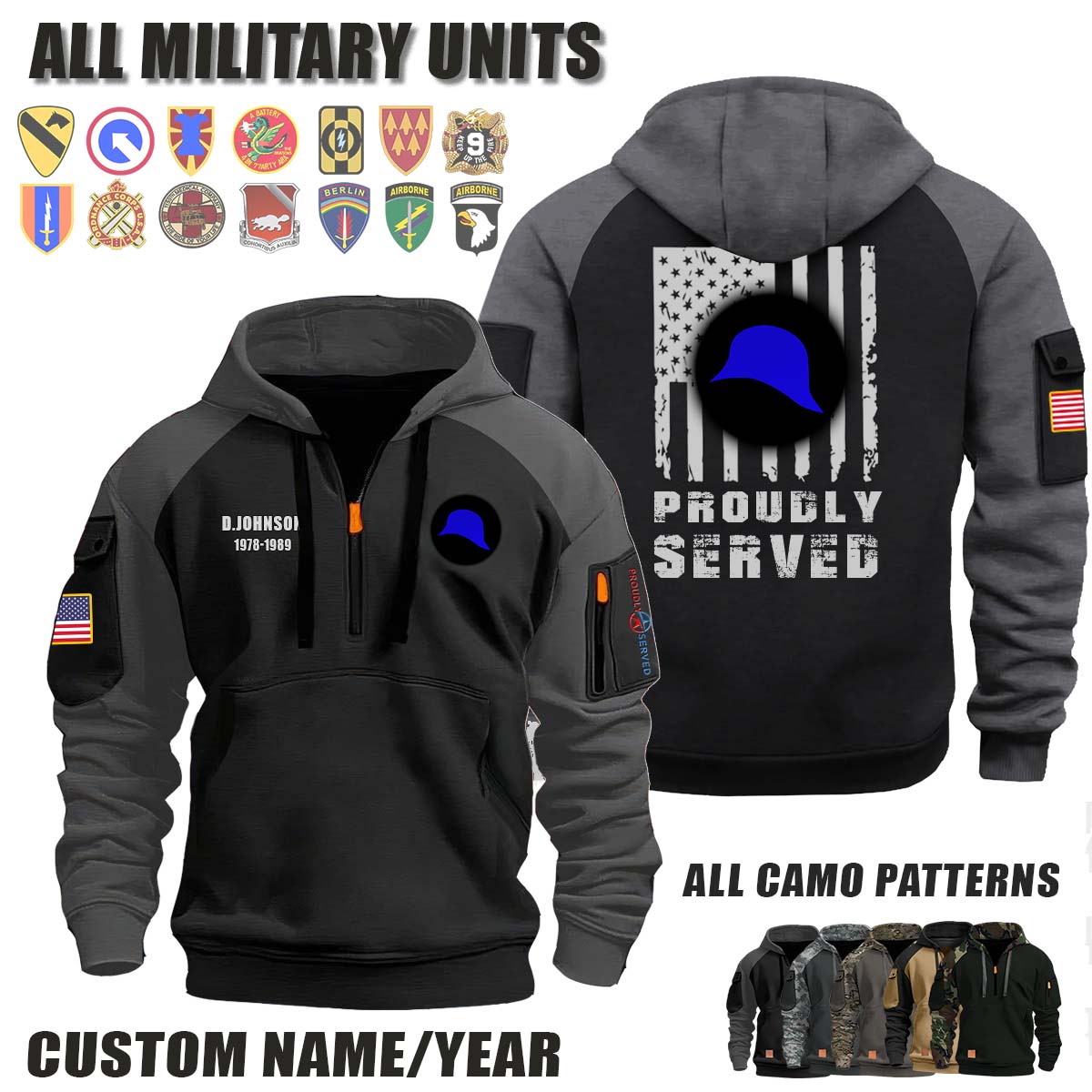 This 93rd ID 93rd Infantry Division_Camo Halfzip Hoodie lets you customize your Branch, Unit, Role, Rank, and Years Served — so your service, sacrifice, and pride live on.