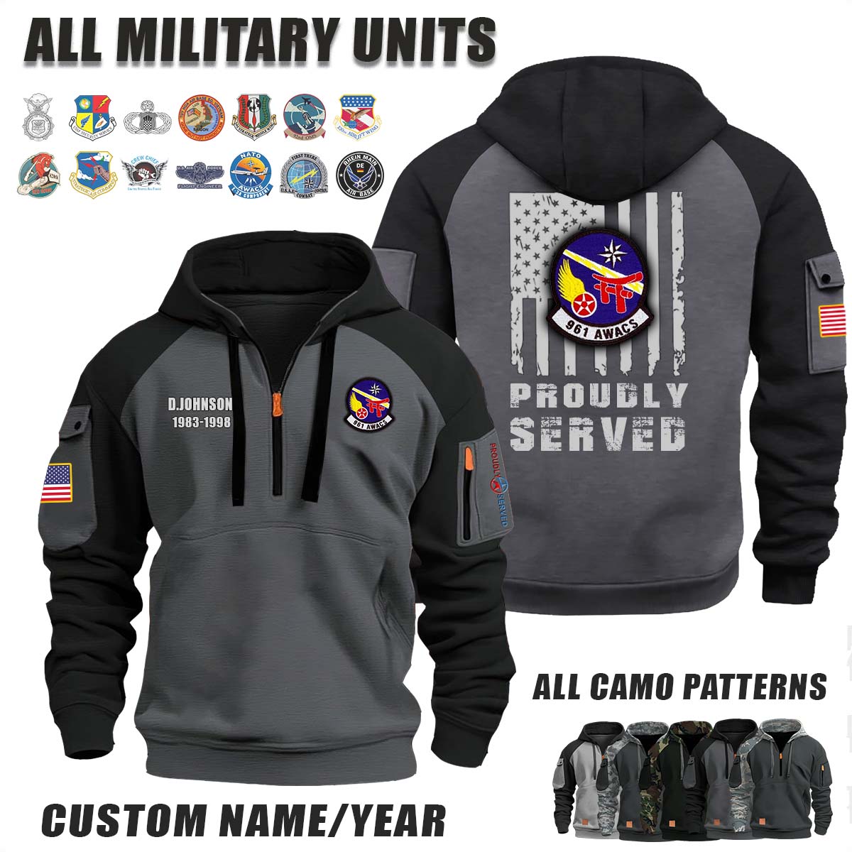 This 961st AWACS 961st Airborne Warning and Control Squadron_Camo Halfzip Hoodie lets you customize your Branch, Unit, Role, Rank, and Years Served — so your service, sacrifice, and pride live on.