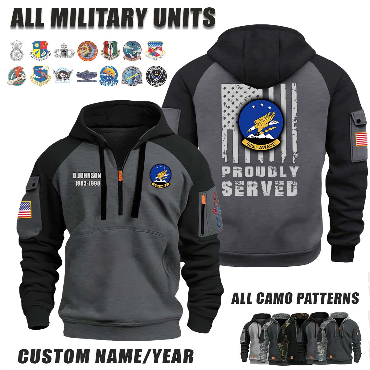 This 965th AWACS Airborne Warning and Control Squadron_Camo Halfzip Hoodie lets you customize your Branch, Unit, Role, Rank, and Years Served — so your service, sacrifice, and pride live on.