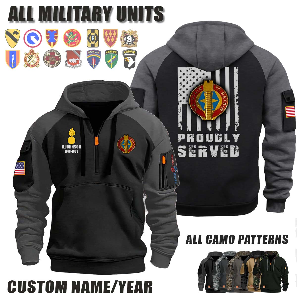 This 986th MAINT BN 986th Maintenance Battalion_Camo Halfzip Hoodie lets you customize your Branch, Unit, Role, Rank, and Years Served — so your service, sacrifice, and pride live on.