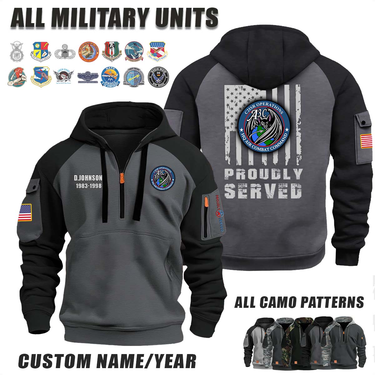 This Air Combat Command ACC A3C_Ver2_Camo Halfzip Hoodie lets you customize your Branch, Unit, Role, Rank, and Years Served — so your service, sacrifice, and pride live on.