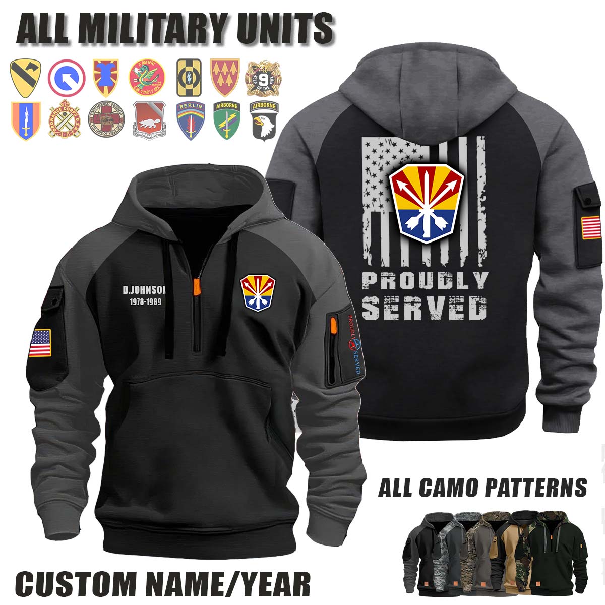 This AZARNG Arizona Army National Guard_Camo Halfzip Hoodie lets you customize your Branch, Unit, Role, Rank, and Years Served — so your service, sacrifice, and pride live on.