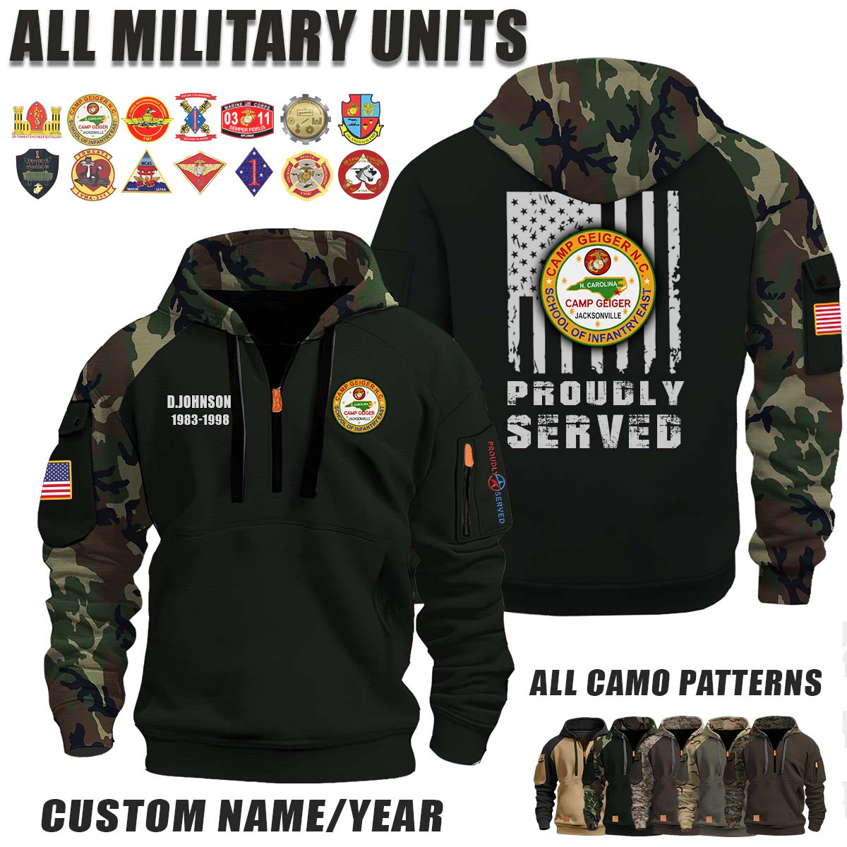 This Camp Geiger_Camo Halfzip Hoodie lets you customize your Branch, Unit, Role, Rank, and Years Served — so your service, sacrifice, and pride live on.