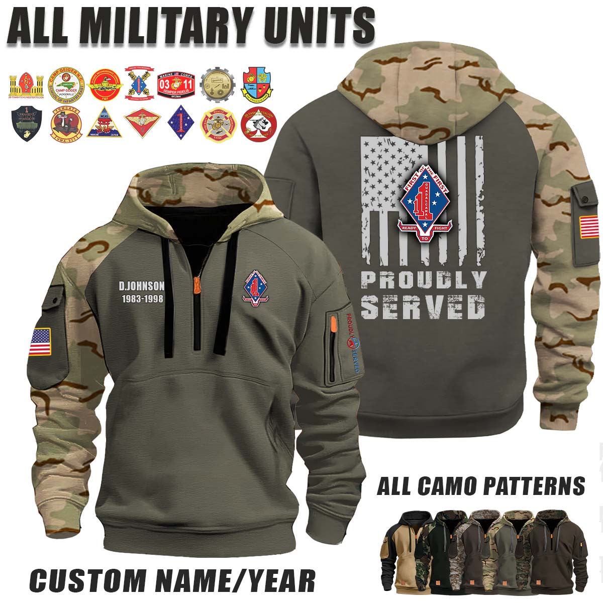 This Charlie Company 1-1 Marines_Camo Halfzip Hoodie lets you customize your Branch, Unit, Role, Rank, and Years Served — so your service, sacrifice, and pride live on.