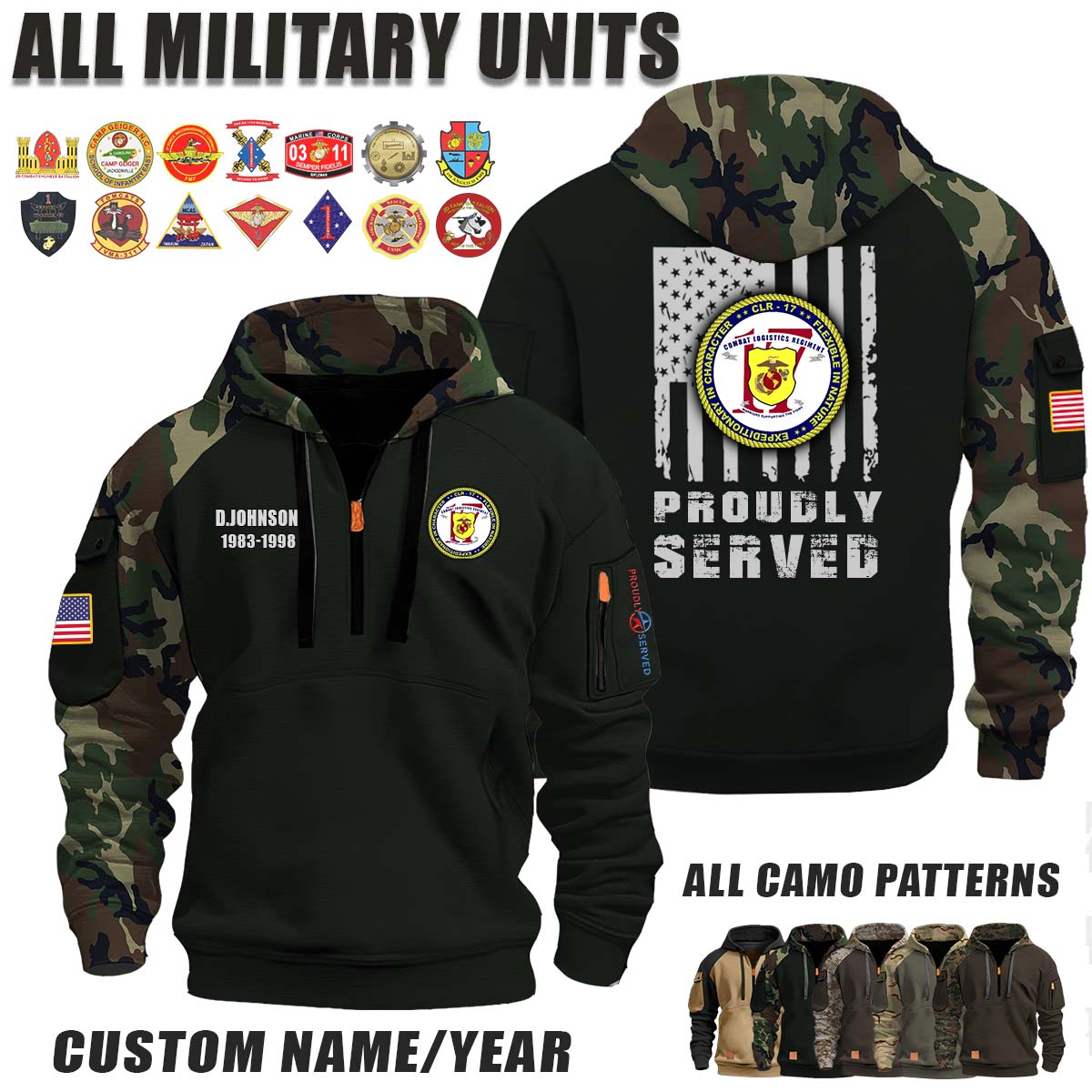 This CLR-17 Combat Logistics Regiment 17_Camo Halfzip Hoodie lets you customize your Branch, Unit, Role, Rank, and Years Served — so your service, sacrifice, and pride live on.