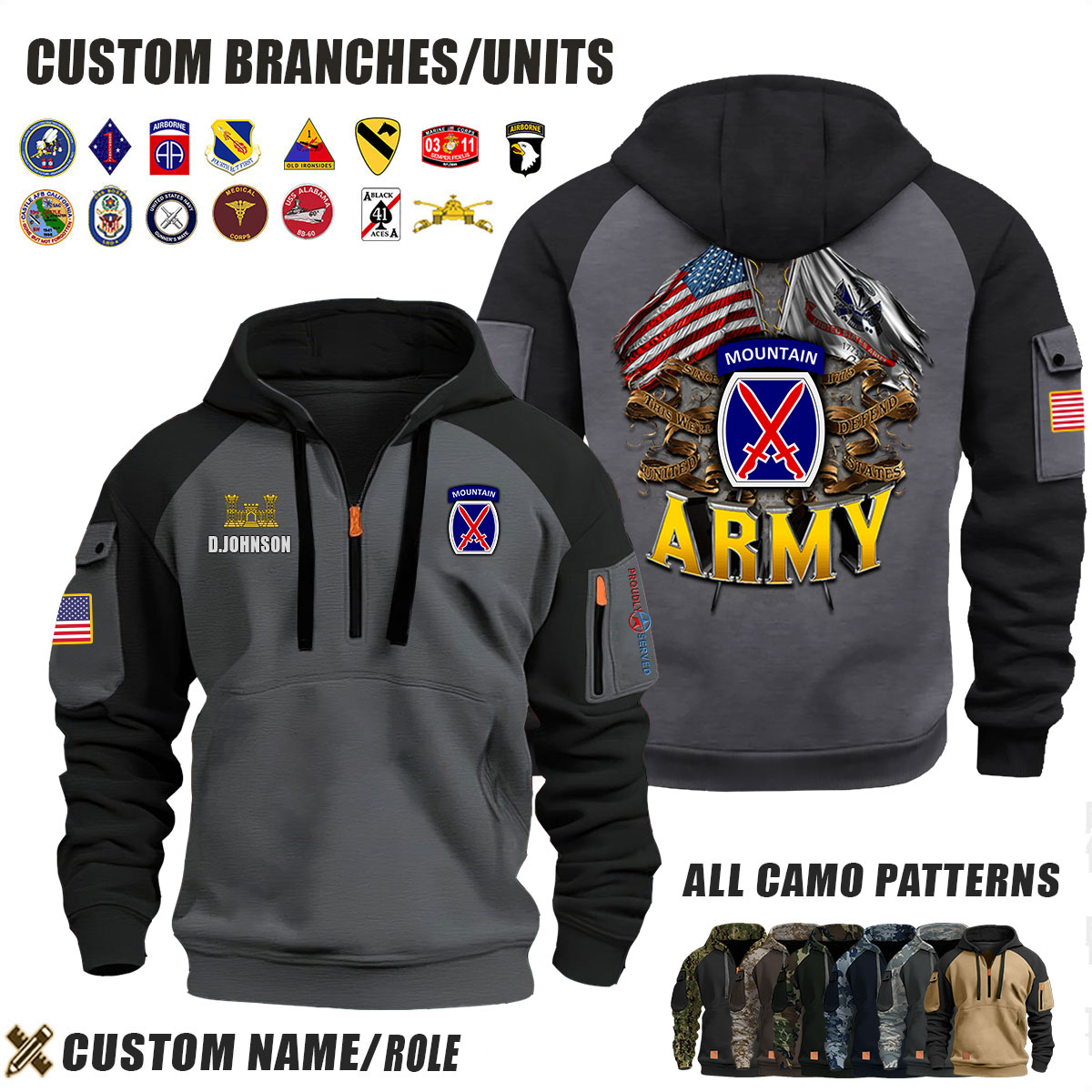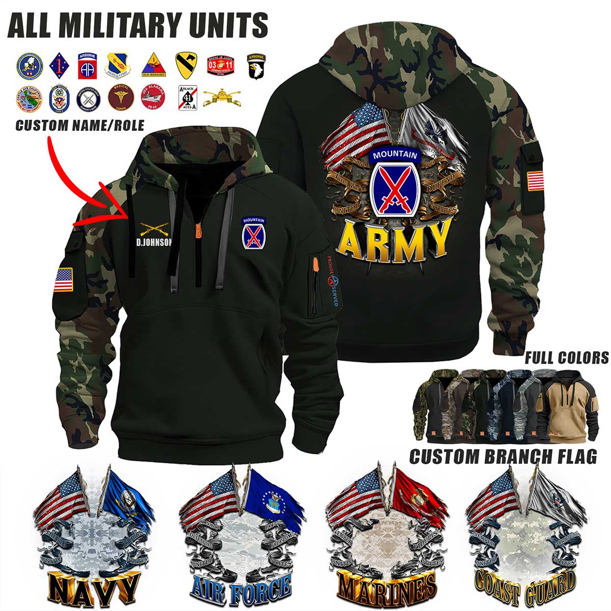 This Custom US Army_ Double Flag Camo Halfzip Hoodie lets you customize your Division, Branch, Role, Rank, and Years Served — so your service and sacrifice are never forgotten.