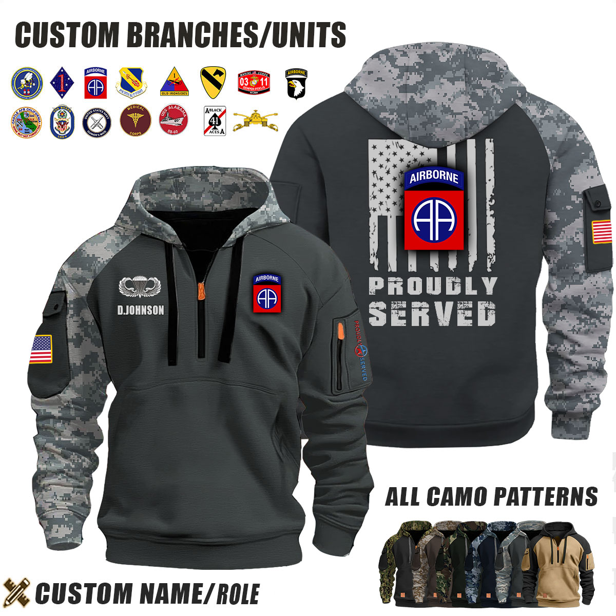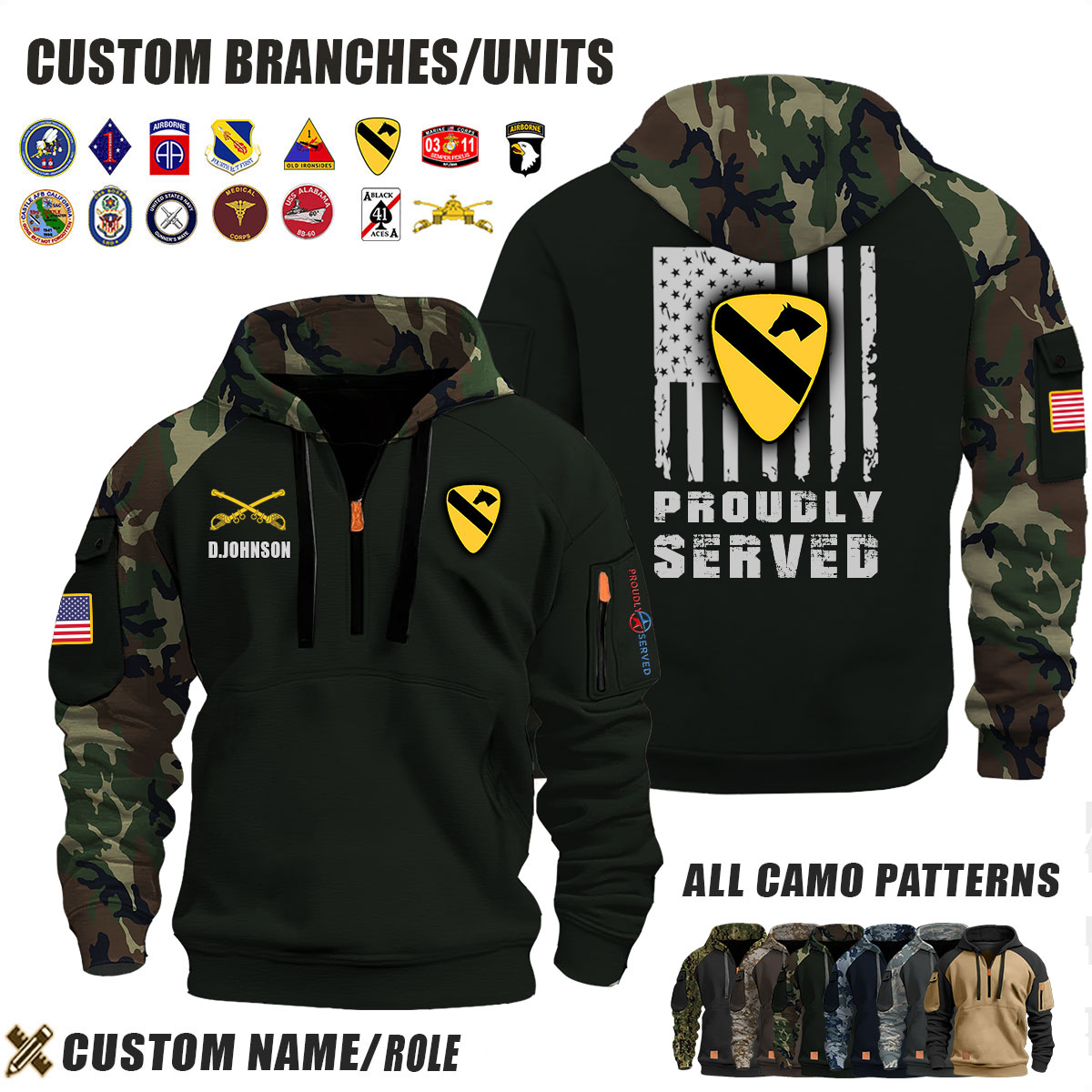 This Custom US Army_Proudly Served Camo Halfzip Hoodie lets you customize your Division, Branch, Role, Rank, and Years Served — so your service and sacrifice are never forgotten.