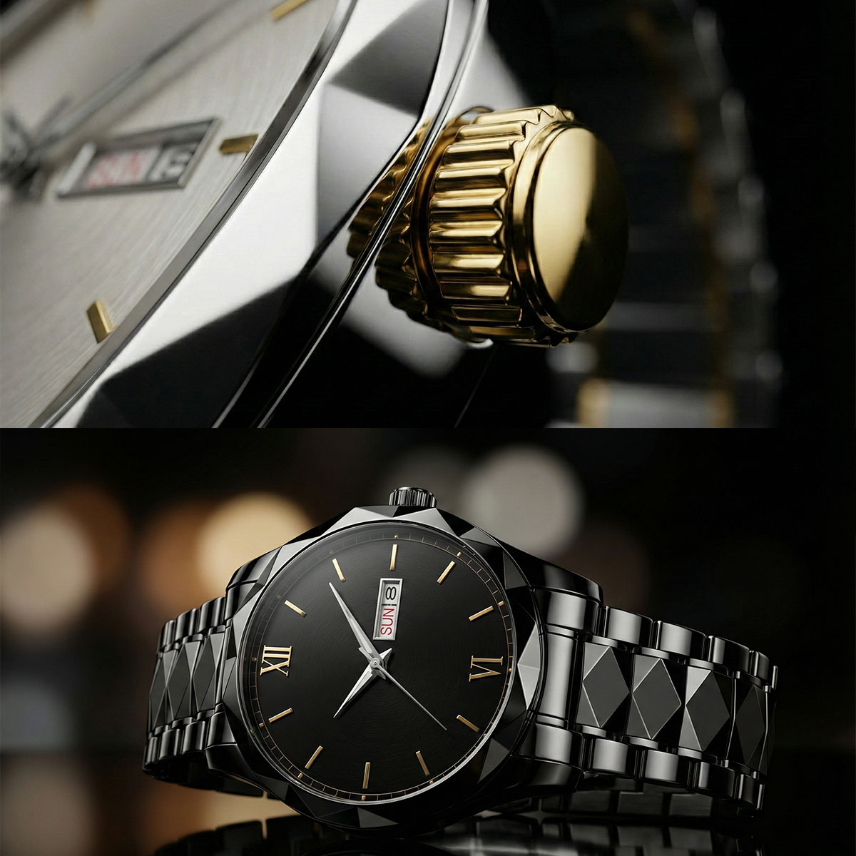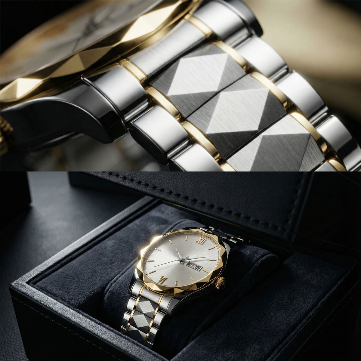Crafted from high-grade stainless steel, this watch is as tough as it is elegant. The scratch-resistant case and solid metal strap ensure long-term durability, while the polished finish gives it a sleek, premium feel. Comfortable for daily wear yet bold enough for special occasions.