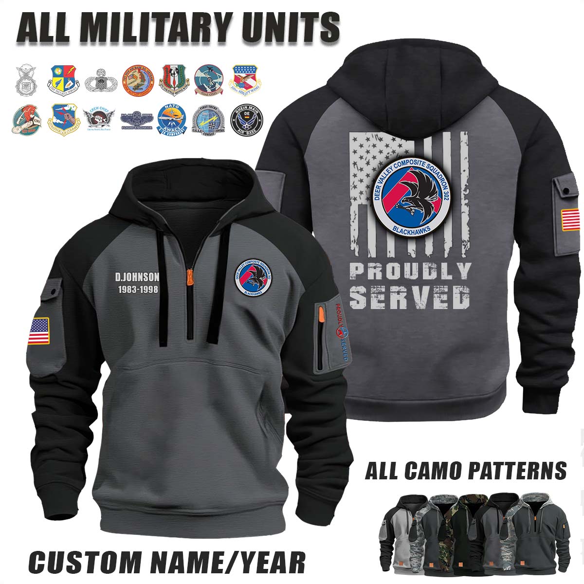 This Deer Valley Composite Squadron 302_Camo Halfzip Hoodie lets you customize your Branch, Unit, Role, Rank, and Years Served — so your service, sacrifice, and pride live on.