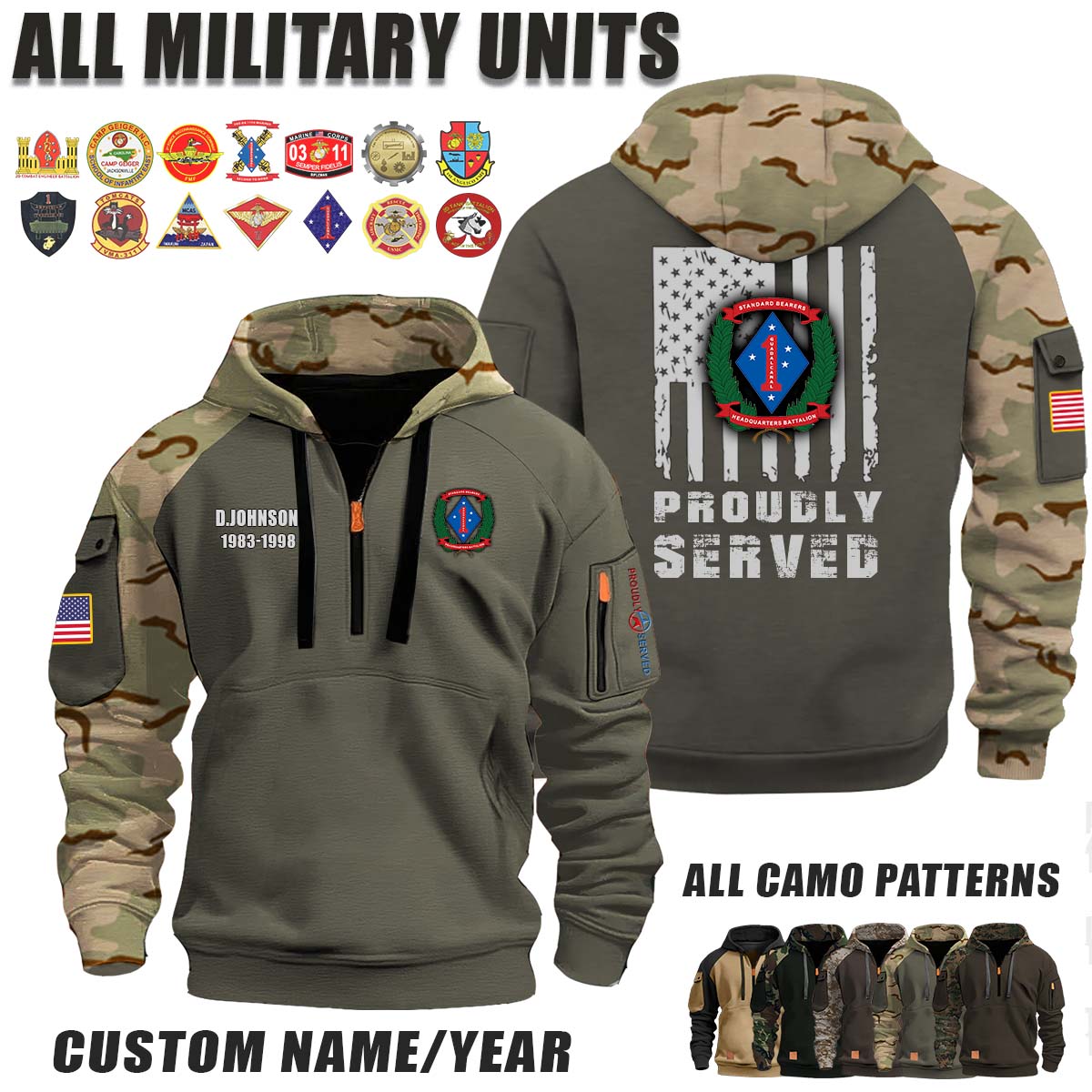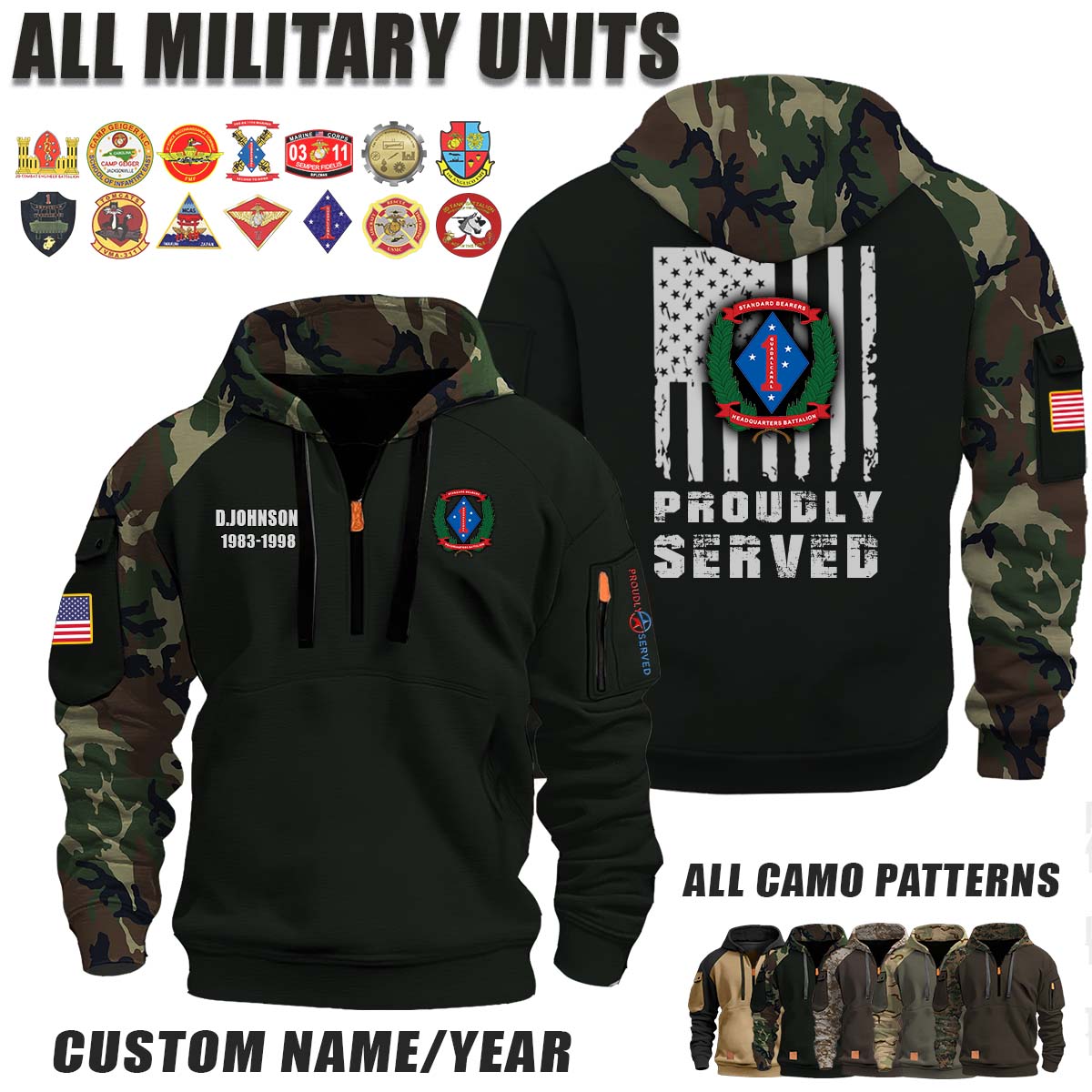 This Headquarters Battalion 1st Marine Division_Camo Halfzip Hoodie lets you customize your Branch, Unit, Role, Rank, and Years Served — so your service, sacrifice, and pride live on.
