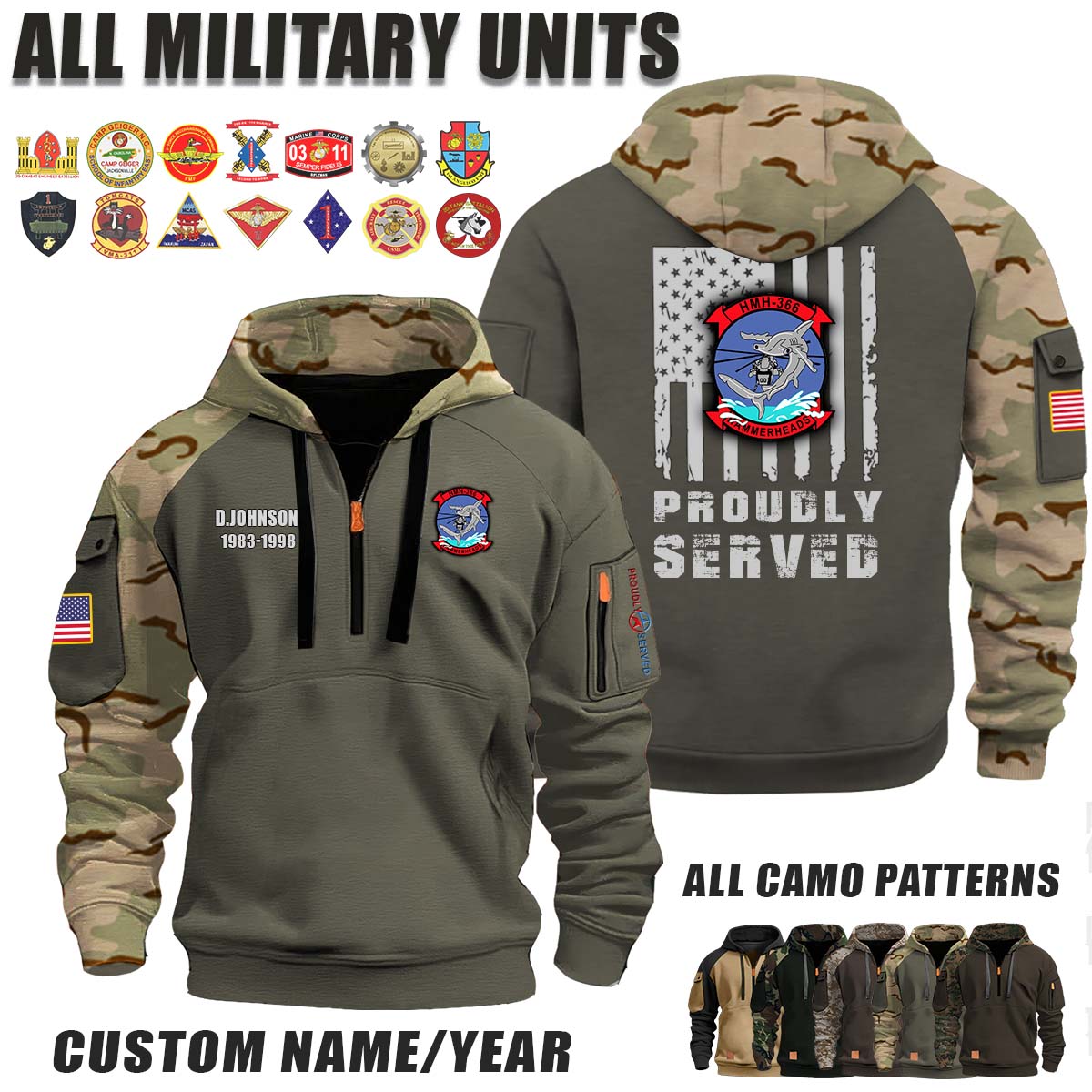 This HMH-366 Hammerheads_Camo Halfzip Hoodie lets you customize your Branch, Unit, Role, Rank, and Years Served — so your service, sacrifice, and pride live on.