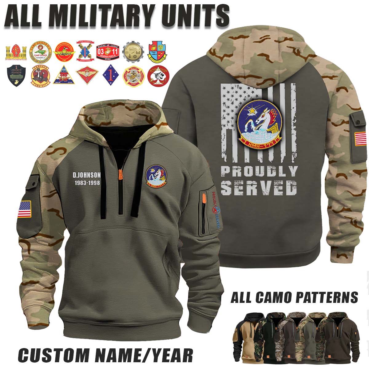 This HMH-777 Flying Armadillos-1_Camo Halfzip Hoodie lets you customize your Branch, Unit, Role, Rank, and Years Served — so your service, sacrifice, and pride live on.