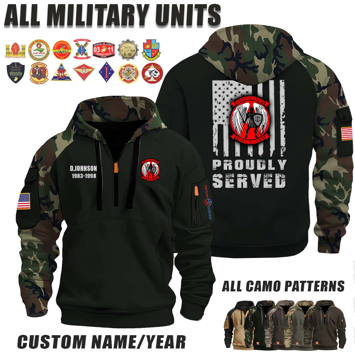 This HMLA-469 Vengeance_Camo Halfzip Hoodie lets you customize your Branch, Unit, Role, Rank, and Years Served — so your service, sacrifice, and pride live on.