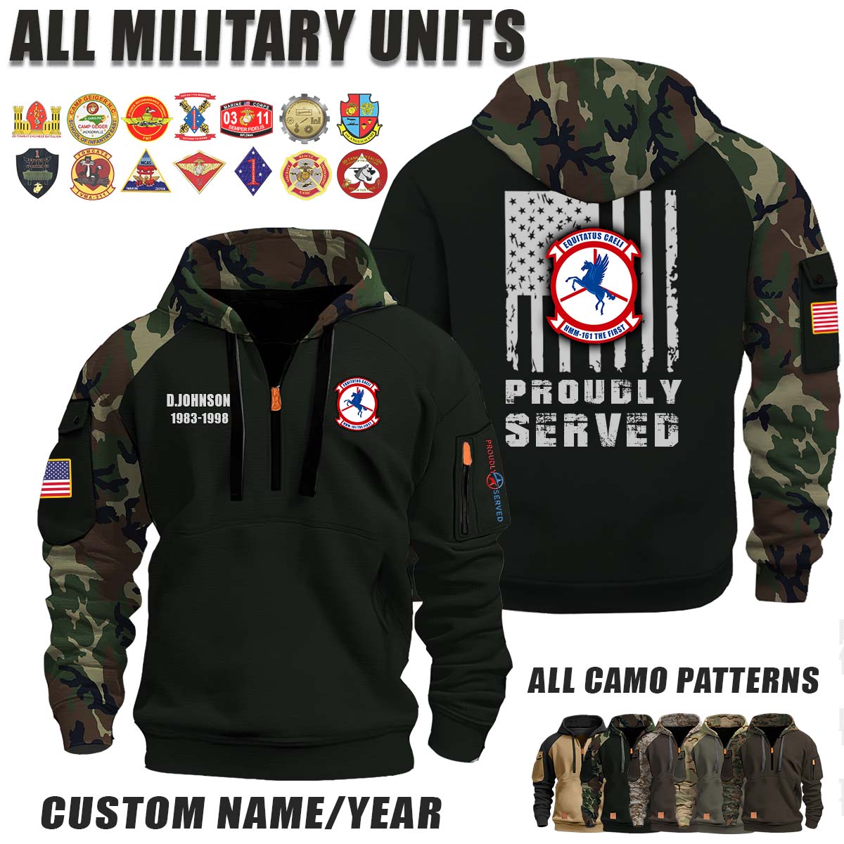 This HMM-161 Greyhawks_Camo Halfzip Hoodie lets you customize your Branch, Unit, Role, Rank, and Years Served — so your service, sacrifice, and pride live on.