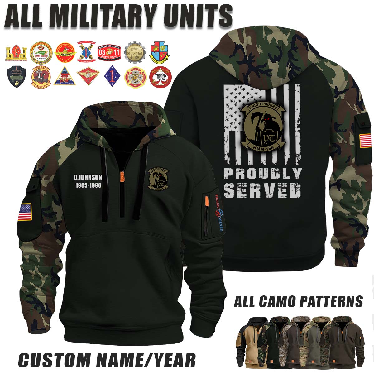 This HMM-164 Knightriders_Camo Halfzip Hoodie lets you customize your Branch, Unit, Role, Rank, and Years Served — so your service, sacrifice, and pride live on.