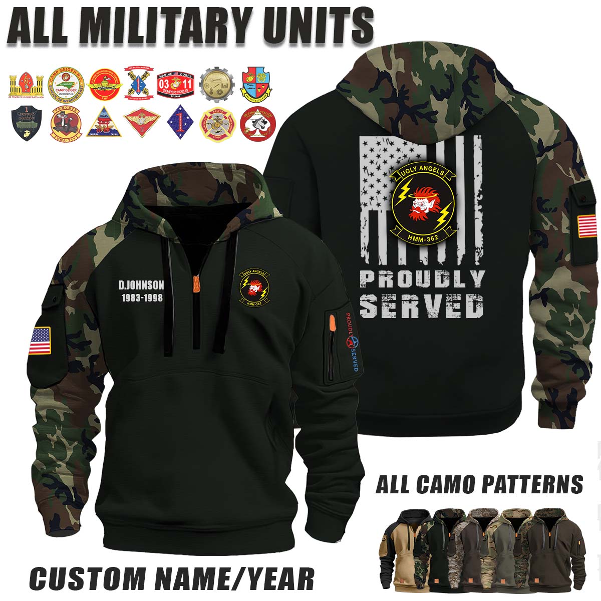 This HMM-362 Ugly Angels_Camo Halfzip Hoodie lets you customize your Branch, Unit, Role, Rank, and Years Served — so your service, sacrifice, and pride live on.