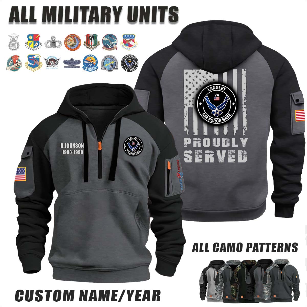This Langley AFB Air Force Base_Camo Halfzip Hoodie lets you customize your Branch, Unit, Role, Rank, and Years Served — so your service, sacrifice, and pride live on.