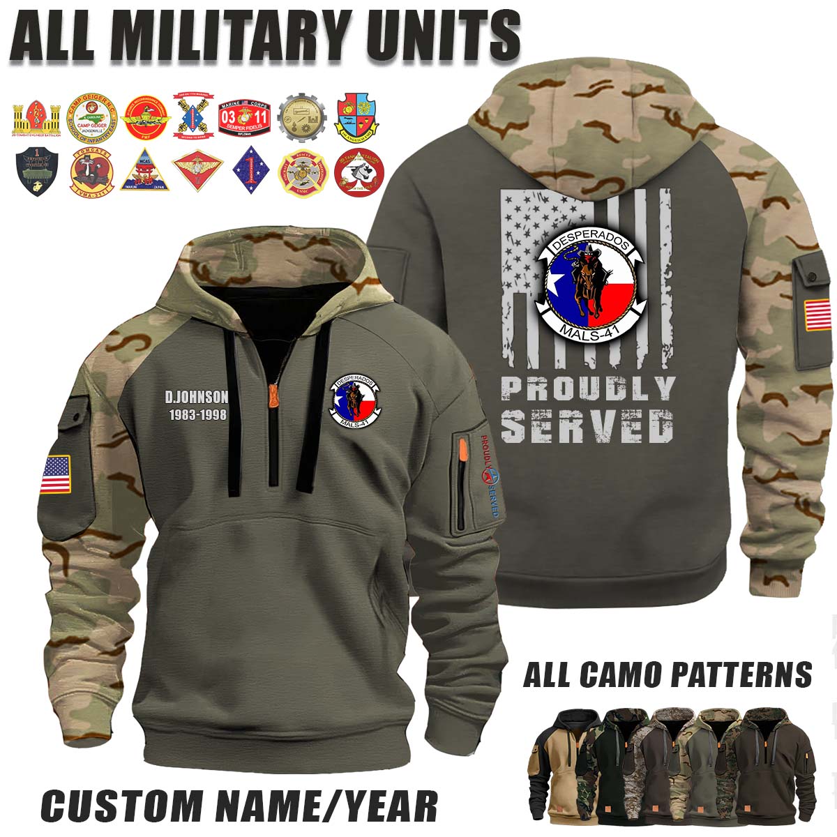 This MALS-41 Desperados_Camo Halfzip Hoodie lets you customize your Branch, Unit, Role, Rank, and Years Served — so your service, sacrifice, and pride live on.