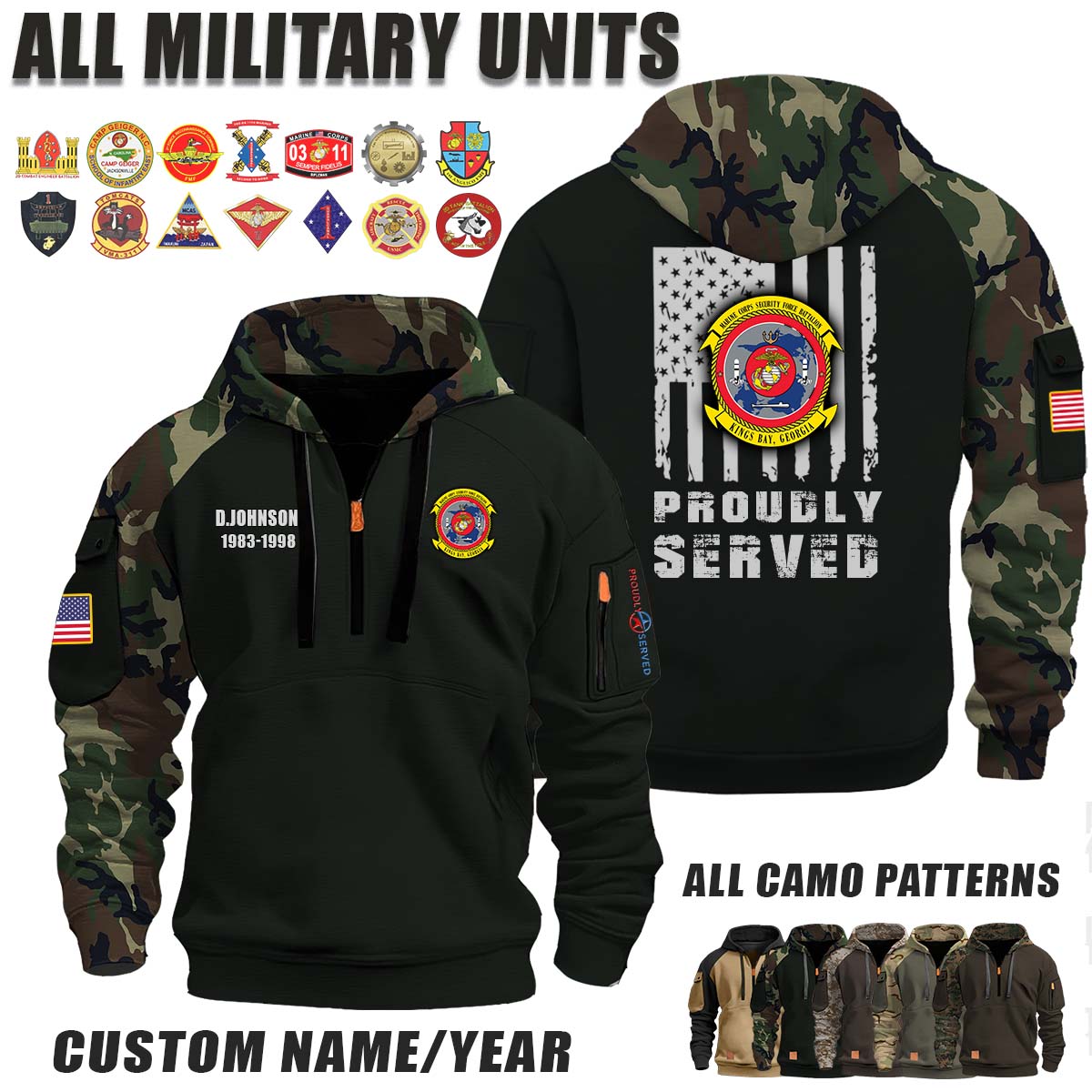 This Marine Security Forces Battalion, Kings Bay_Camo Halfzip Hoodie lets you customize your Branch, Unit, Role, Rank, and Years Served — so your service, sacrifice, and pride live on.