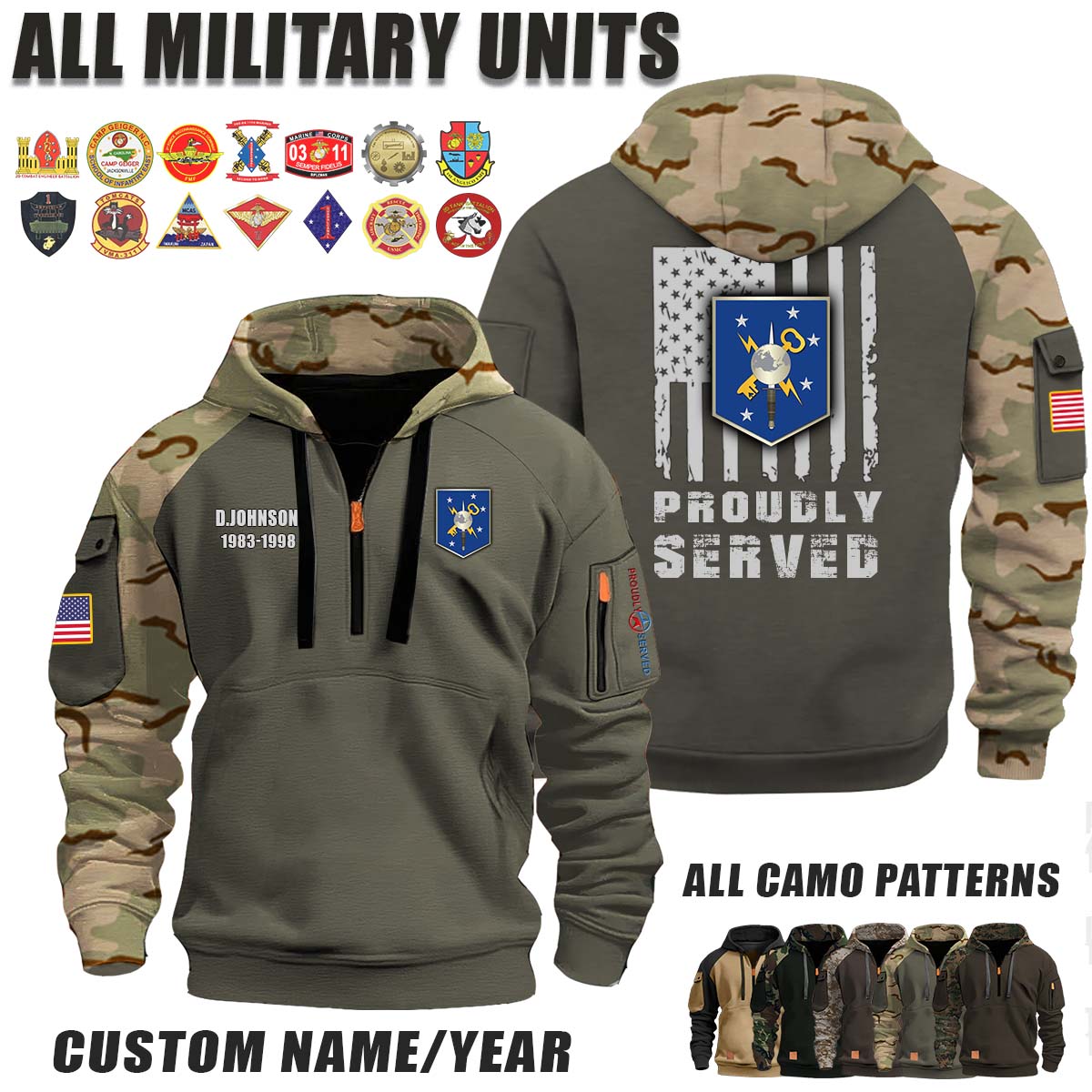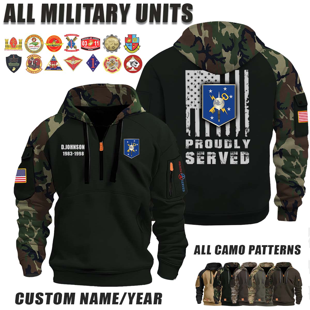 This Marine Special Operations Intelligence Battalion_Camo Halfzip Hoodie lets you customize your Branch, Unit, Role, Rank, and Years Served — so your service, sacrifice, and pride live on.
