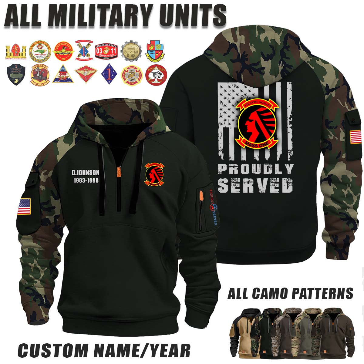 This MASS-1 Chieftain_Camo Halfzip Hoodie lets you customize your Branch, Unit, Role, Rank, and Years Served — so your service, sacrifice, and pride live on.