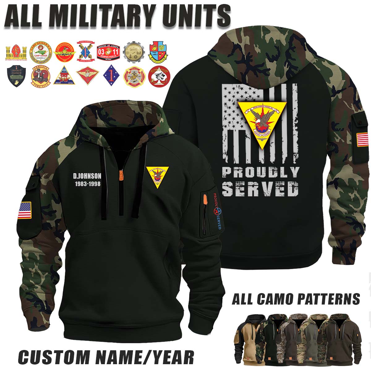 This MCAS Cherry Point Marine Corps Air Station Cherry Point_Camo Halfzip Hoodie lets you customize your Branch, Unit, Role, Rank, and Years Served — so your service, sacrifice, and pride live on.