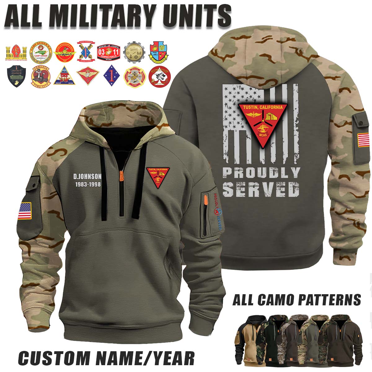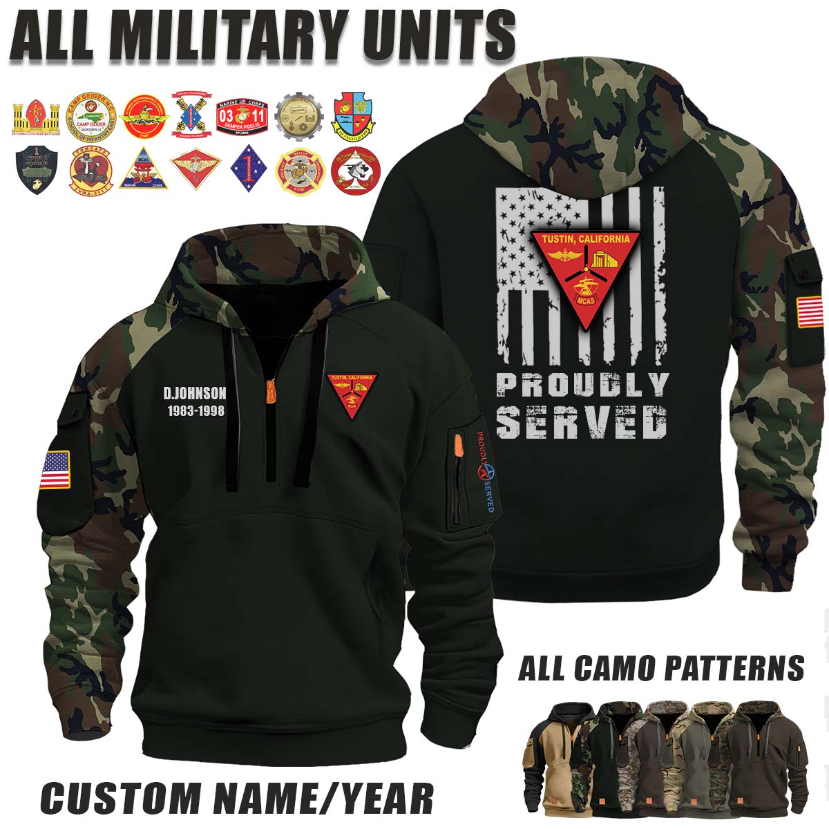 This MCAS Marine Corps Air Station Tustin_Camo Halfzip Hoodie lets you customize your Branch, Unit, Role, Rank, and Years Served — so your service, sacrifice, and pride live on.