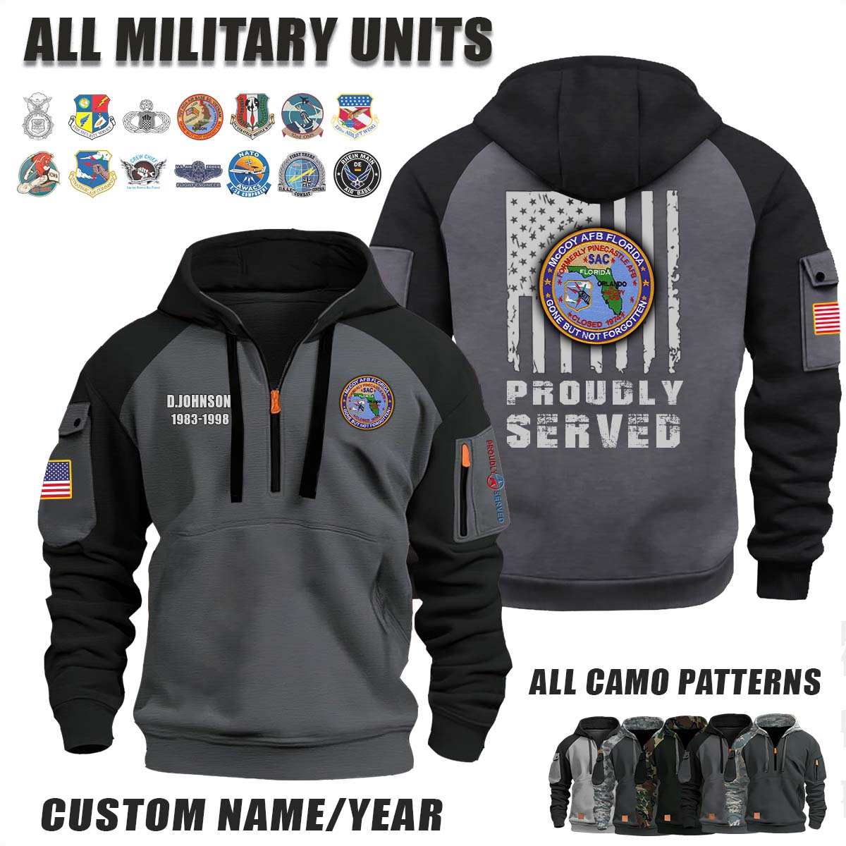 This McCoy AFB Air Force Base_Camo Halfzip Hoodie lets you customize your Branch, Unit, Role, Rank, and Years Served — so your service, sacrifice, and pride live on.
