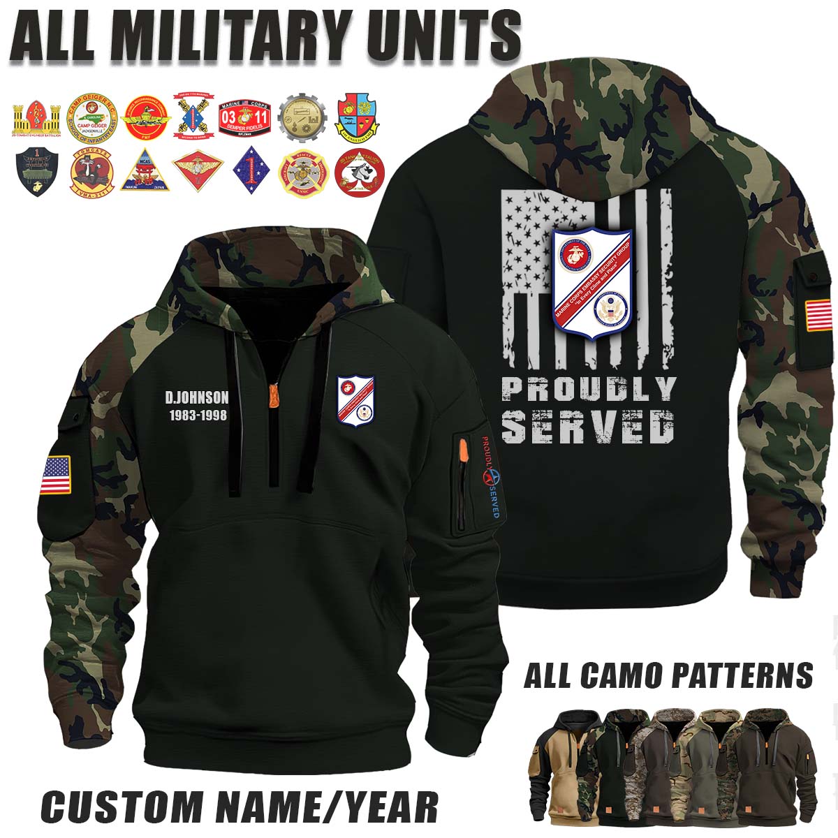 This MCESG Marine Corps Embassy Security Group_Camo Halfzip Hoodie lets you customize your Branch, Unit, Role, Rank, and Years Served — so your service, sacrifice, and pride live on.