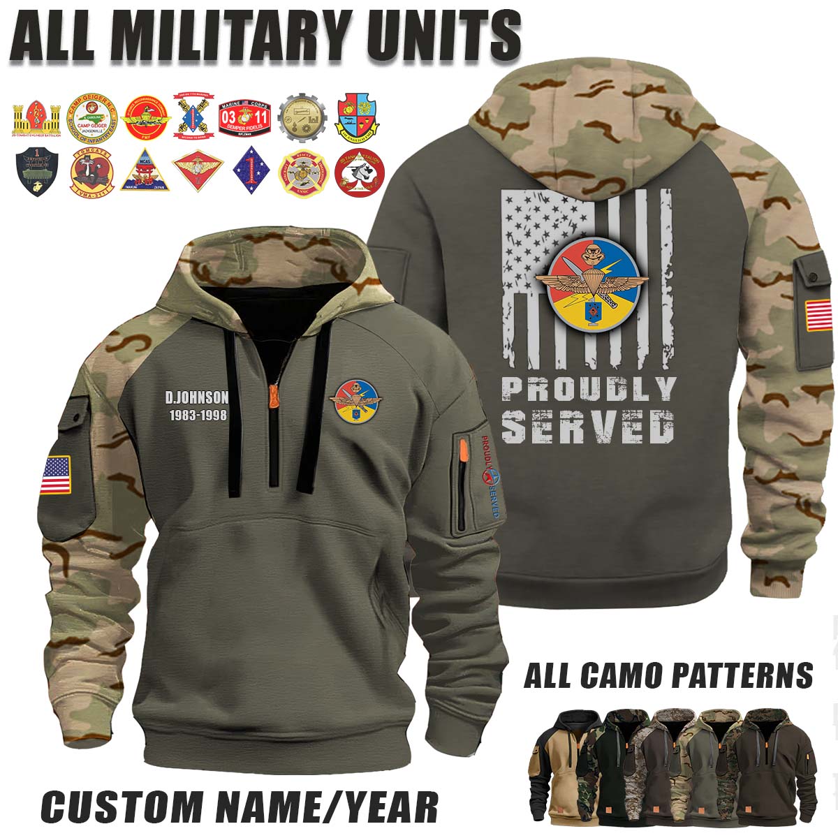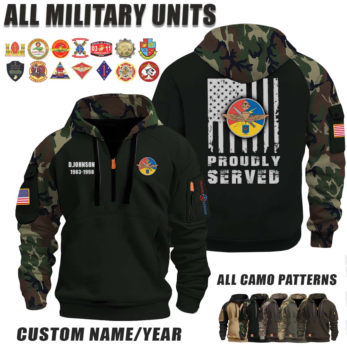 This MCSOCOM Detachment One_Camo Halfzip Hoodie lets you customize your Branch, Unit, Role, Rank, and Years Served — so your service, sacrifice, and pride live on.