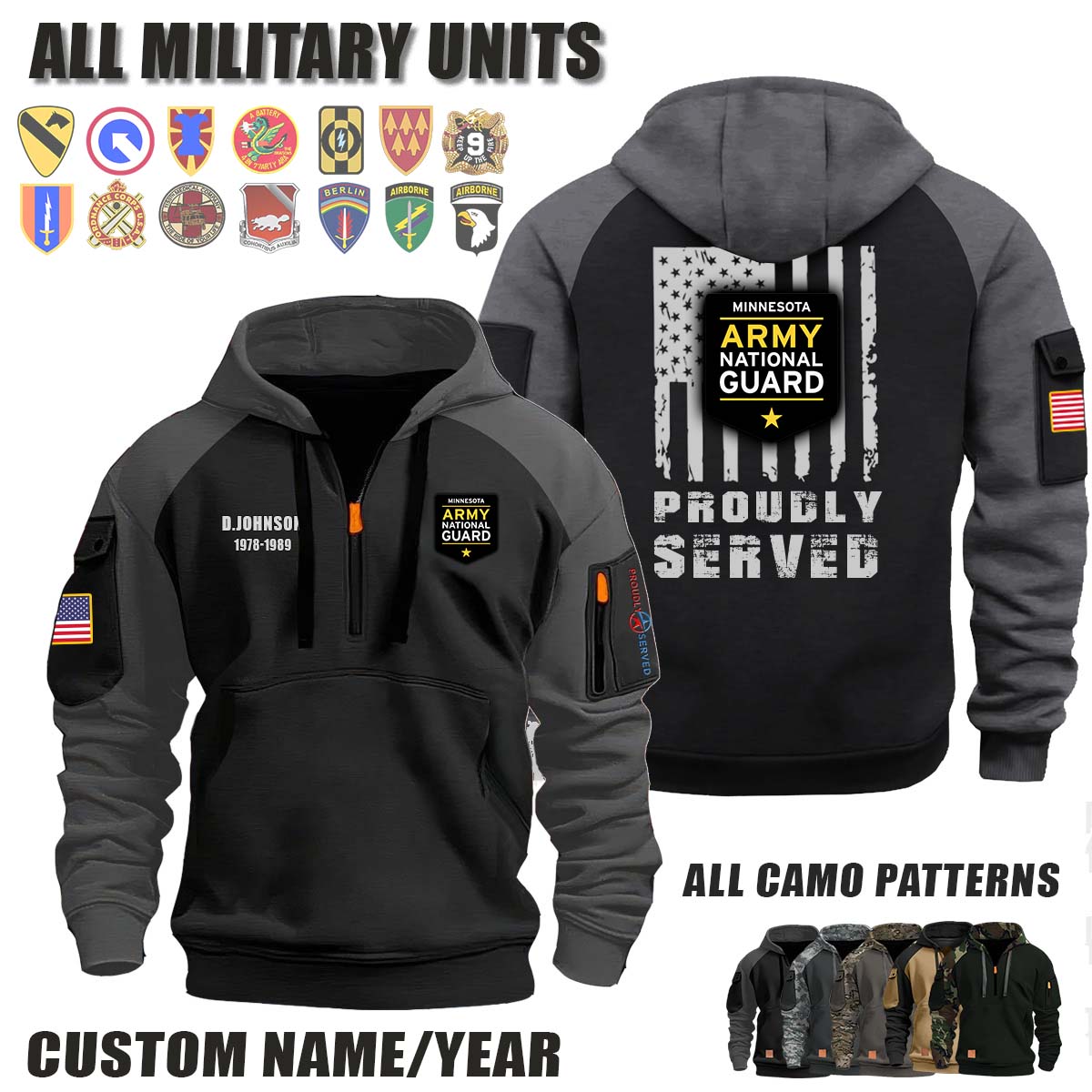 This MNARNG Minnesota Army National Guard_Camo Halfzip Hoodie lets you customize your Branch, Unit, Role, Rank, and Years Served — so your service, sacrifice, and pride live on.