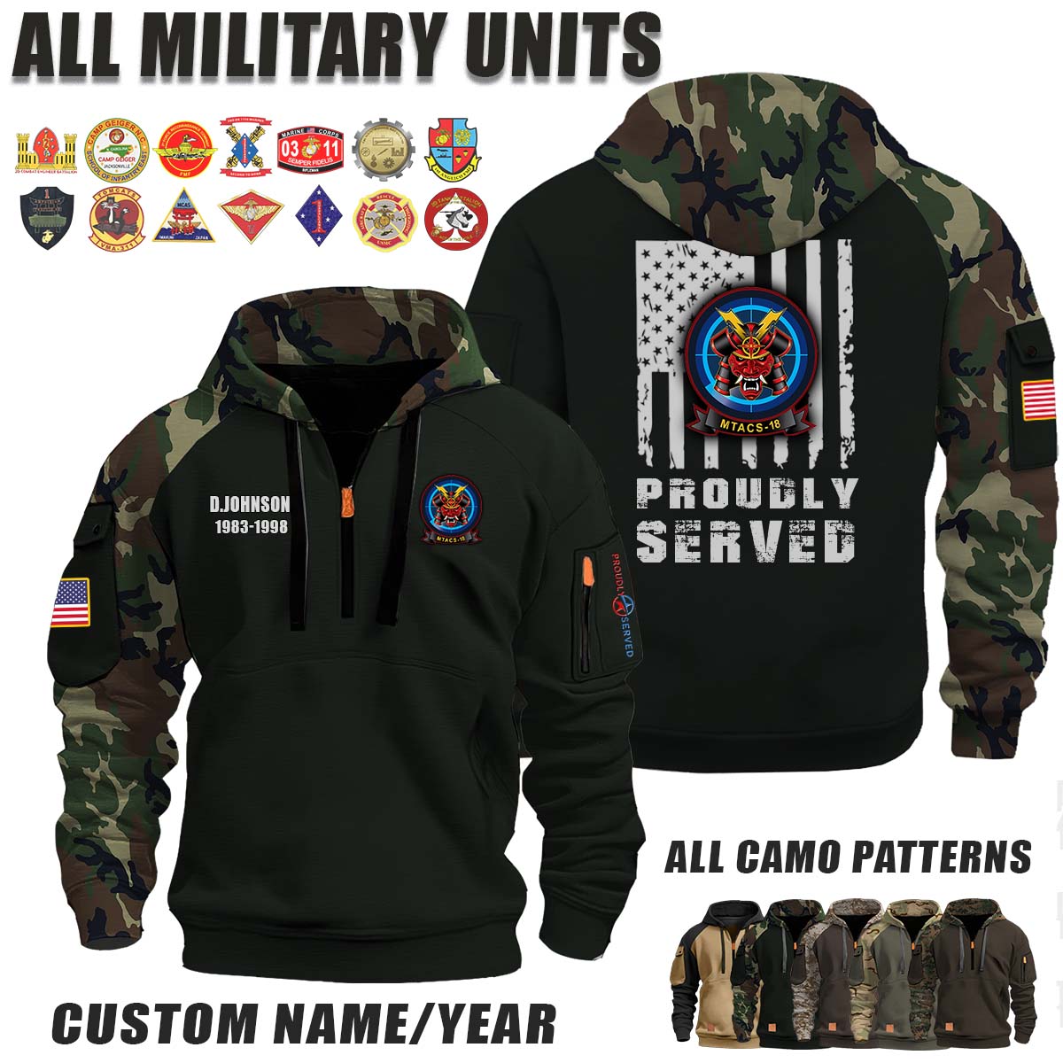 This MTACS-18_Camo Halfzip Hoodie lets you customize your Branch, Unit, Role, Rank, and Years Served — so your service, sacrifice, and pride live on.