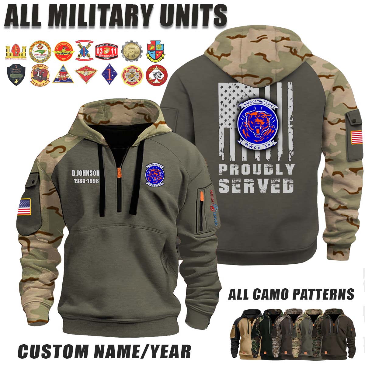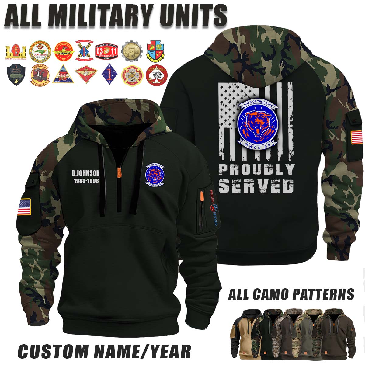 This MWCS-48_Camo Halfzip Hoodie lets you customize your Branch, Unit, Role, Rank, and Years Served — so your service, sacrifice, and pride live on.