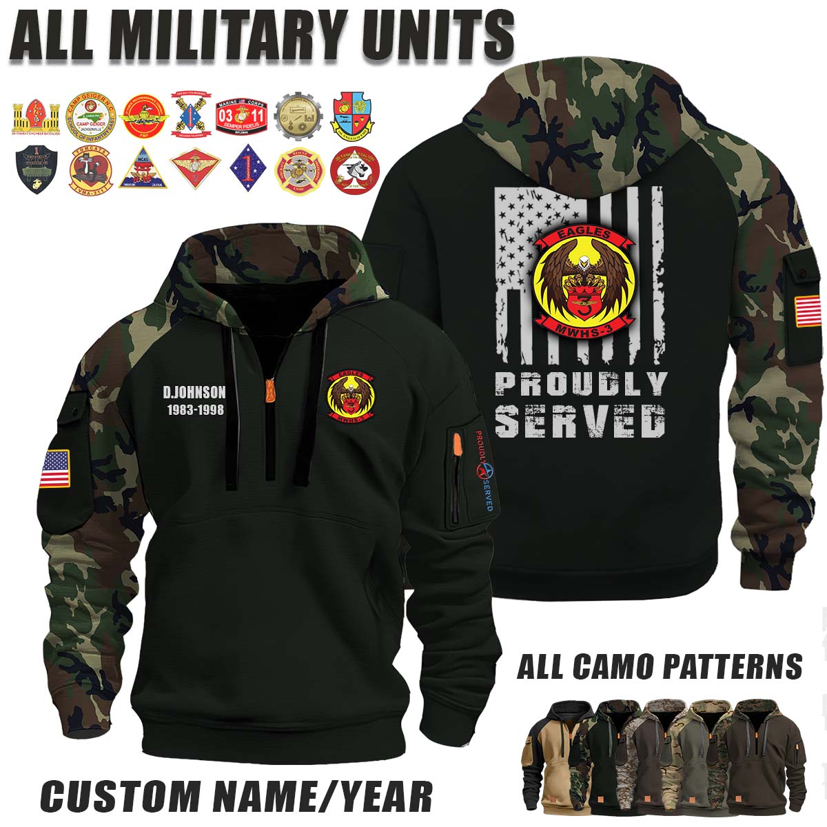 This MWHS-3 Marine Wing Headquarters Squadron 3_Camo Halfzip Hoodie lets you customize your Branch, Unit, Role, Rank, and Years Served — so your service, sacrifice, and pride live on.