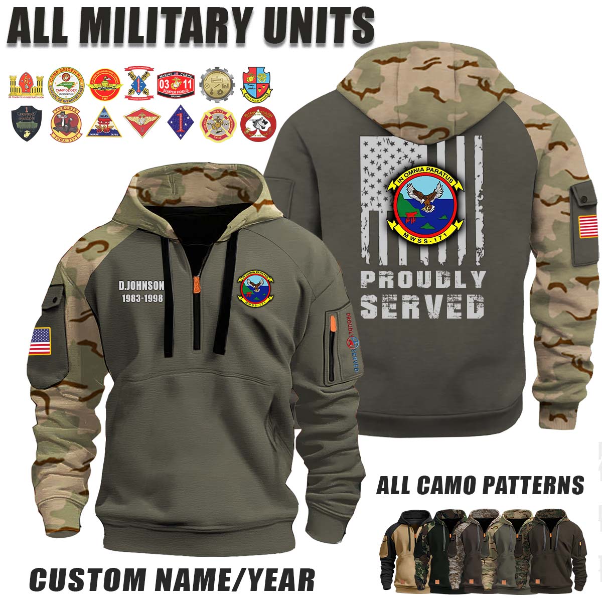 This MWSS-171 The Sentinels_Camo Halfzip Hoodie lets you customize your Branch, Unit, Role, Rank, and Years Served — so your service, sacrifice, and pride live on.